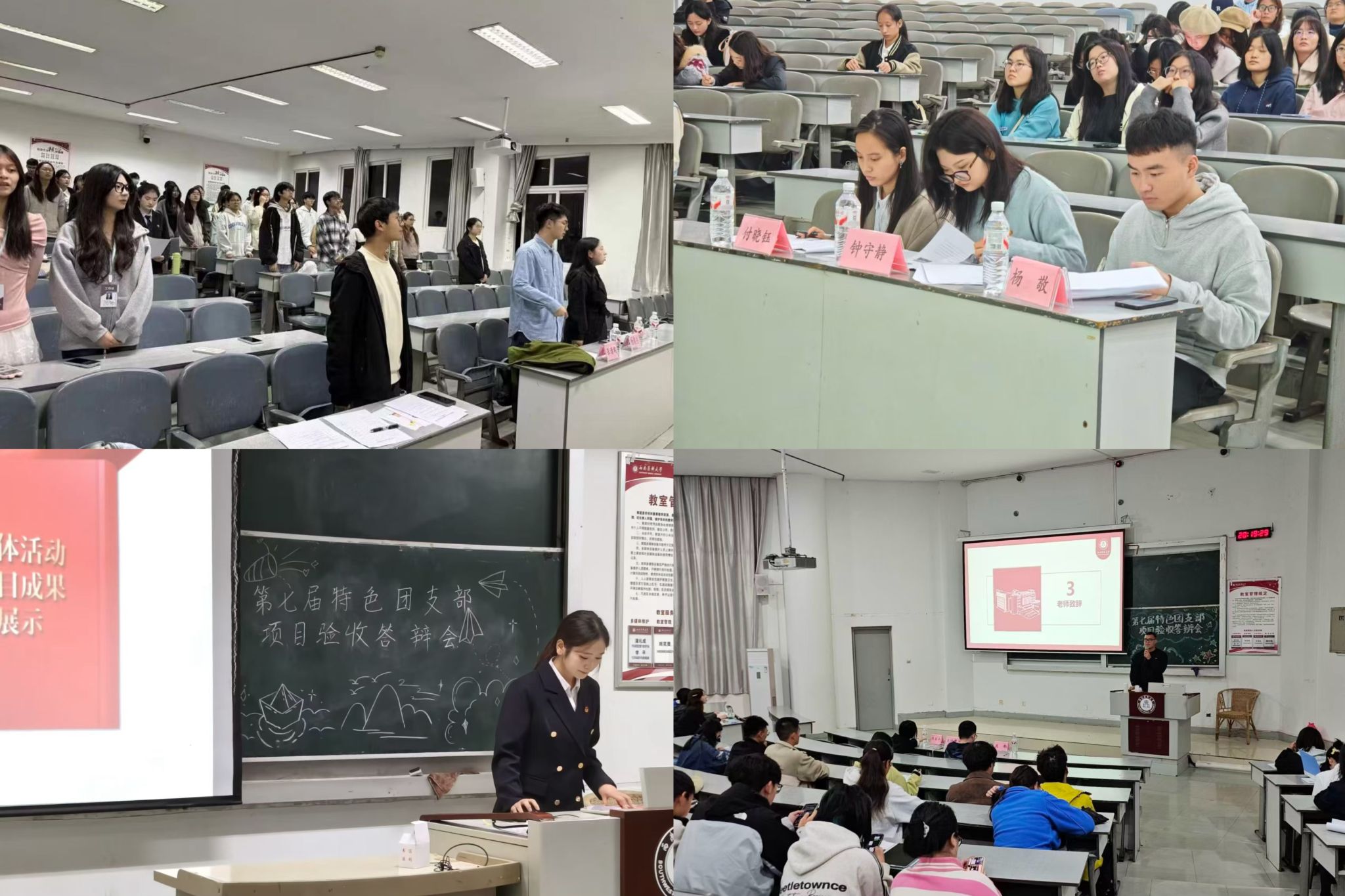 答辩会在全体参会人员齐唱团歌中拉开序幕。在答辩展示环节,各团支书围绕支部特色活动开展情况进行系统汇报,充分展现各支部在“班团一体化”运行、“三会两制一课”落实、新媒体思想宣传等方面的探索与成效。提问环节,评委结合汇报内容,从工作完整度、主题契合度、内容创新度及可持续发展等方面展开深入提问,各答辩代表沉着应答,体现出扎实的组织能力与思考深度。评委组对申报支部的建设成果表示肯定,并就成果凝练与辐射推广提出建设性意见。